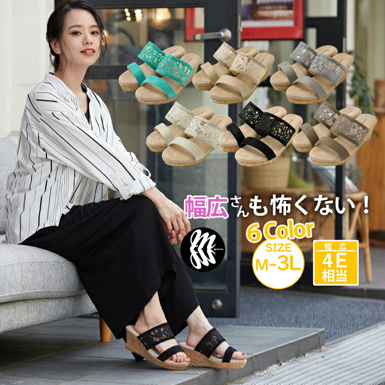 ※大きいサイズ レディース 靴 | 4E 幅広 ふかふかクッションのフラワーレース サンダル _ 靴 M L LL 3L 23.5cm 24.0cm 25.0cm 25.5cm 夏 夏物 歩きやすい ウェッジソール ヒール ウェッジ かわいい ウェッジサンダル 厚底サンダル [463013] OMMCM 【ミンミン】